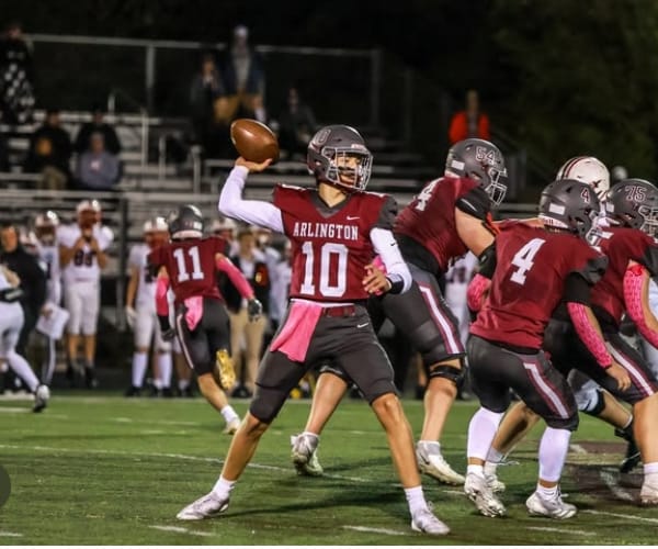 This week, I interviewed Senior Captain Gavin Carreiro who plays center. Gavin joined the team two weeks late freshman year and has been playing ever since. His favorite part about playing football is getting to practice with his teammates every day and playing under Friday night lights with them. Like many of his teammates, his favorite team tradition is singing the Arlington fight song after a win.